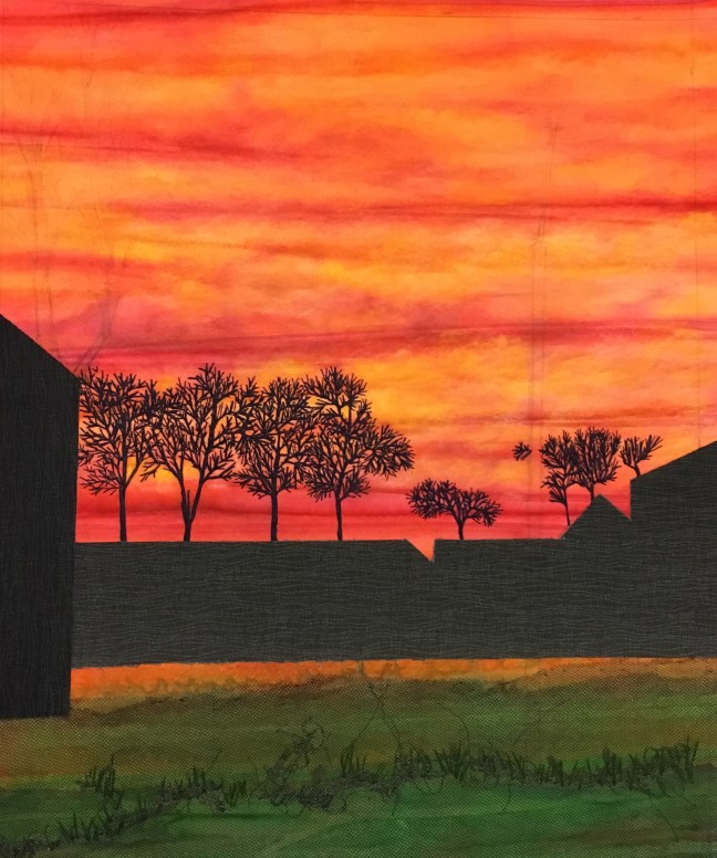 I have completed another sunrise art quilt from pictures I took one early March morning in my neighborhood. I wanted this piece to focus on the colors of the sky ranging from yellow to dark rich red. I started with some commercial batiks that had the colors I wanted to use as a base moving from the orange to a green grass for the base. Collageing the two pieces of fabric together it appears I could have used just the fabric but thought the stripes of color in the sky were too predictable.