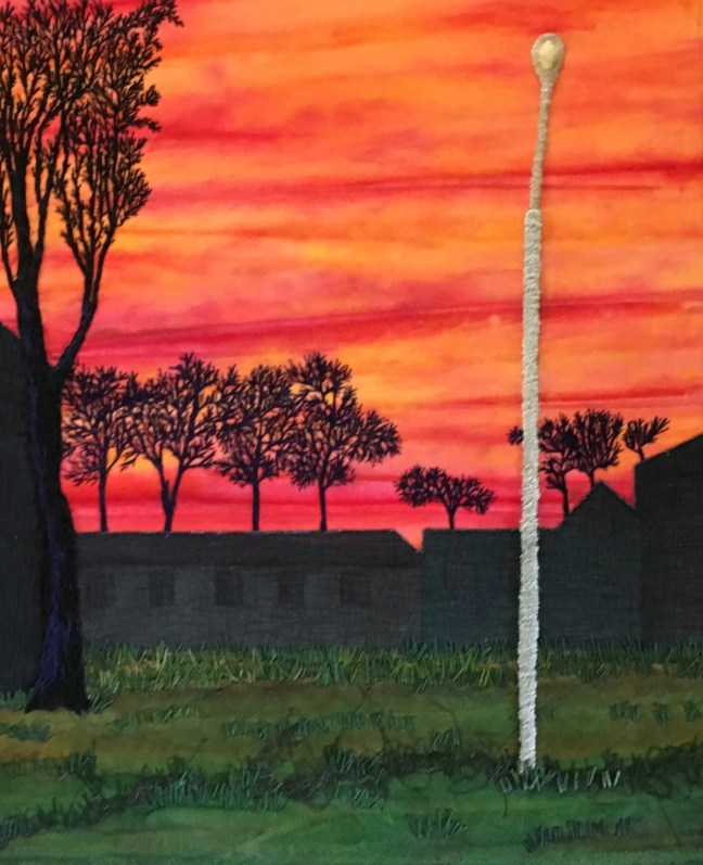 I started the light pole using a needlepoint thread that is a mix of wool and silk in a muddy gray color. I love the sheen of the silk in this fiber making it look reflective just like metal. I did a satin stitch at an angle so it would appear three demensional. This took a bit of time and patience to keep it all aligned but not flat. Once I got to the top I switched to a smaller spun wool in an earthy gray for the standard that holds the bulb. Using the same wool but in a whiter color I stitched the bulb making it a satin stitch also. Decided it wasn’t convincing so lightly went over the bulb area with a yellow watercolor pencil. Using a small brush I set the color into the fiber with water.